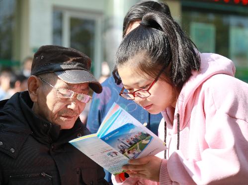 11月5日,在峡江县水边镇百花公园,县社保局工作人员在向居民讲解社保知识。当日,该县开展"全民参保登记"宣传活动,通过悬挂标语、摆放展板、发放资料、设置咨询台等形式,向社区居民宣传医疗保险、养老保险等相关政策法规,现场解答有关问题。 福平、张春香摄